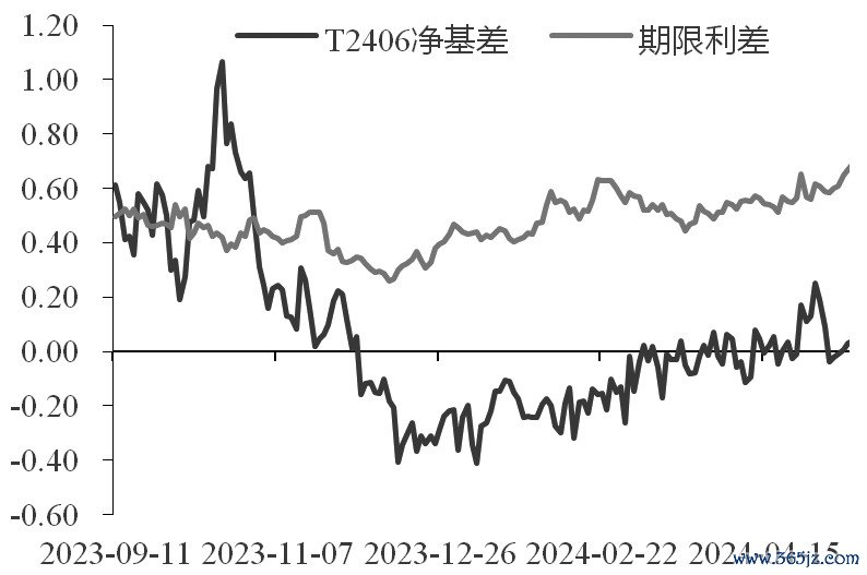 图为T2406净基差、10年期与1年期利差走势