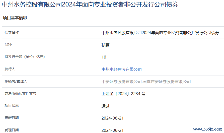 【大河财立方消息】8月22日消息在线炒股配资平台,中州水务控股有限公司2024年面向专业投资者非公开发行公司债券项目获上交所通过。债券拟发行金额10亿元,承销商/管理人为平安证券、国泰君安证券。