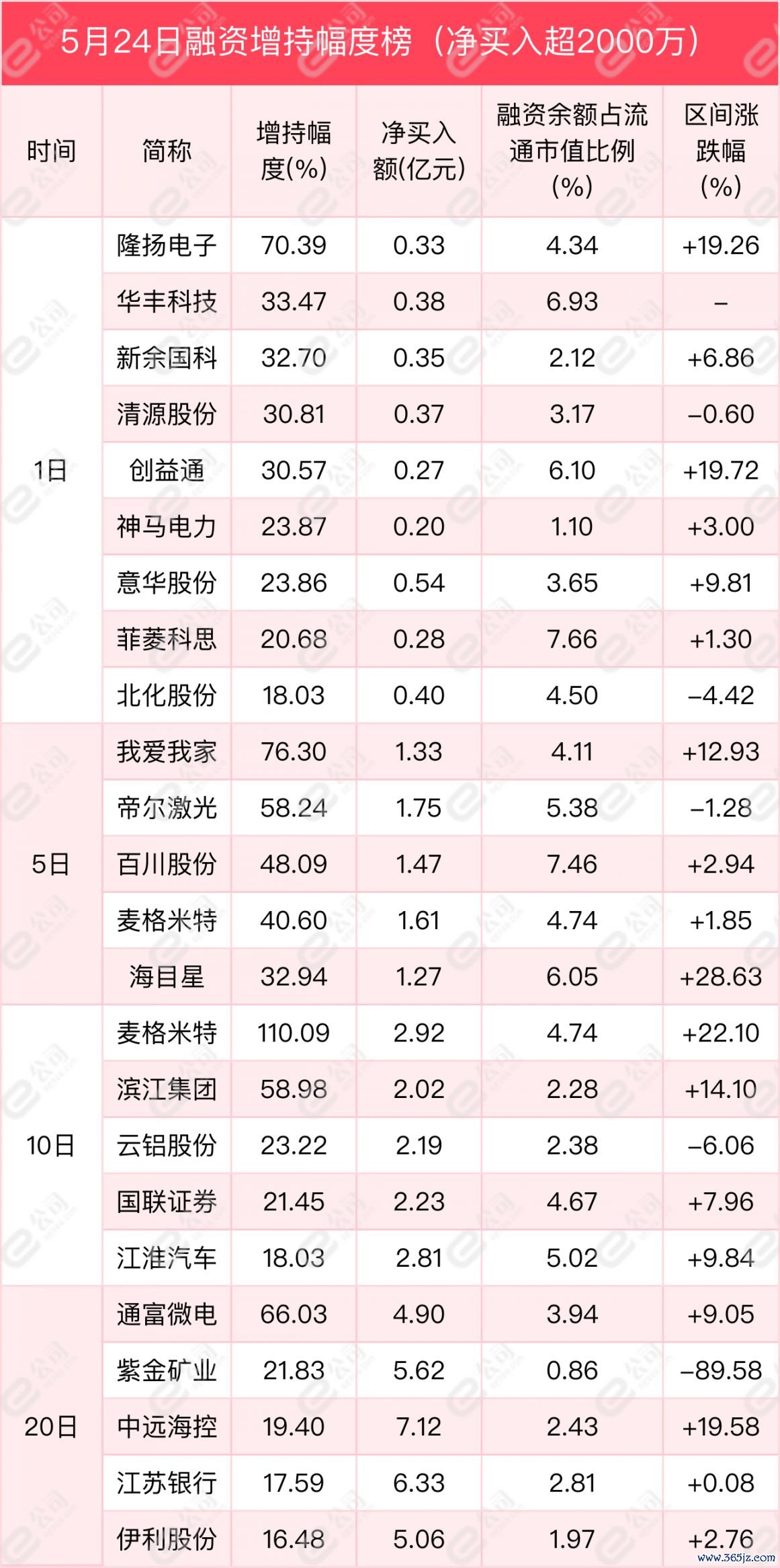 从增减持幅度来看,单日净买卖超2000万元以上的个股中,隆扬电子、华丰科技、新余国科获融资增持幅度居前,分别为70.39%、33.47%、32.7%。