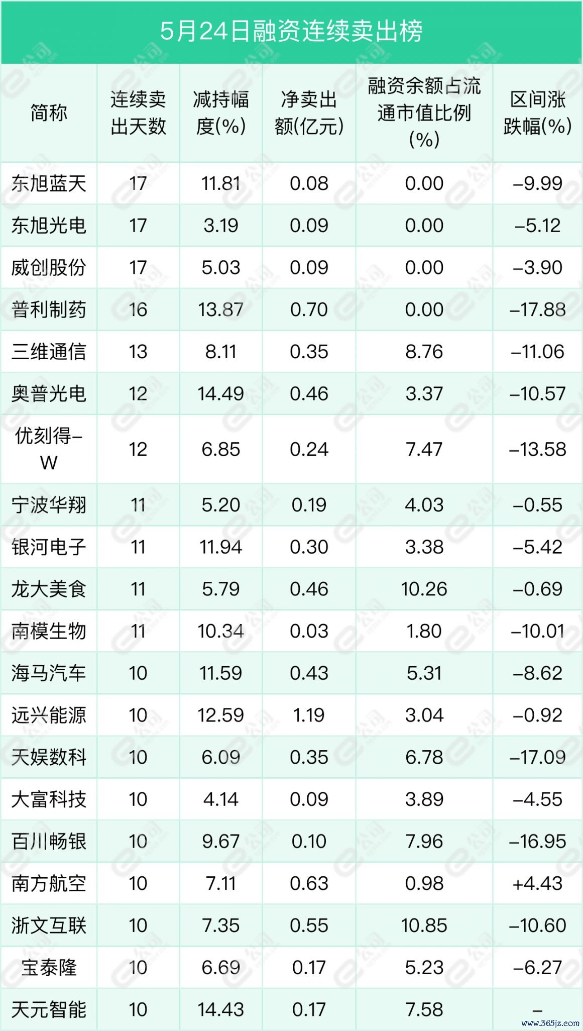 东旭蓝天、东旭光电、威创股份遭融资连续净卖出天数居前,分别为17天、17天、17天,期间净卖出额分别为0.08亿元、0.09亿元、0.09亿元,期间减持幅度分别为11.81%、3.19%、5.03%。