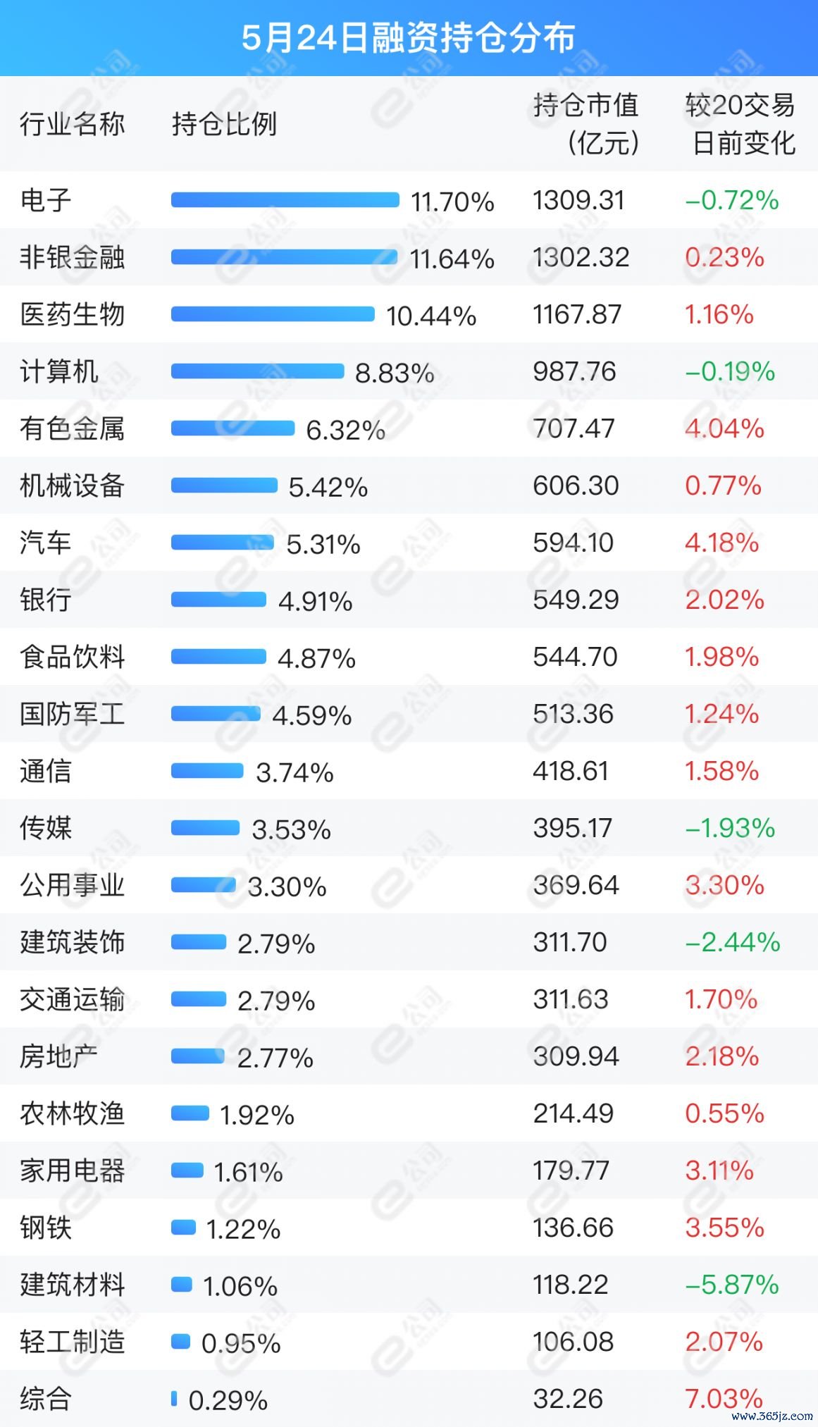 e公司数据统计显示,截至5月24日,融资持仓市值前五行业为电子、非银金融、医药生物、计算机、有色金属,占持仓总市值48.94%。