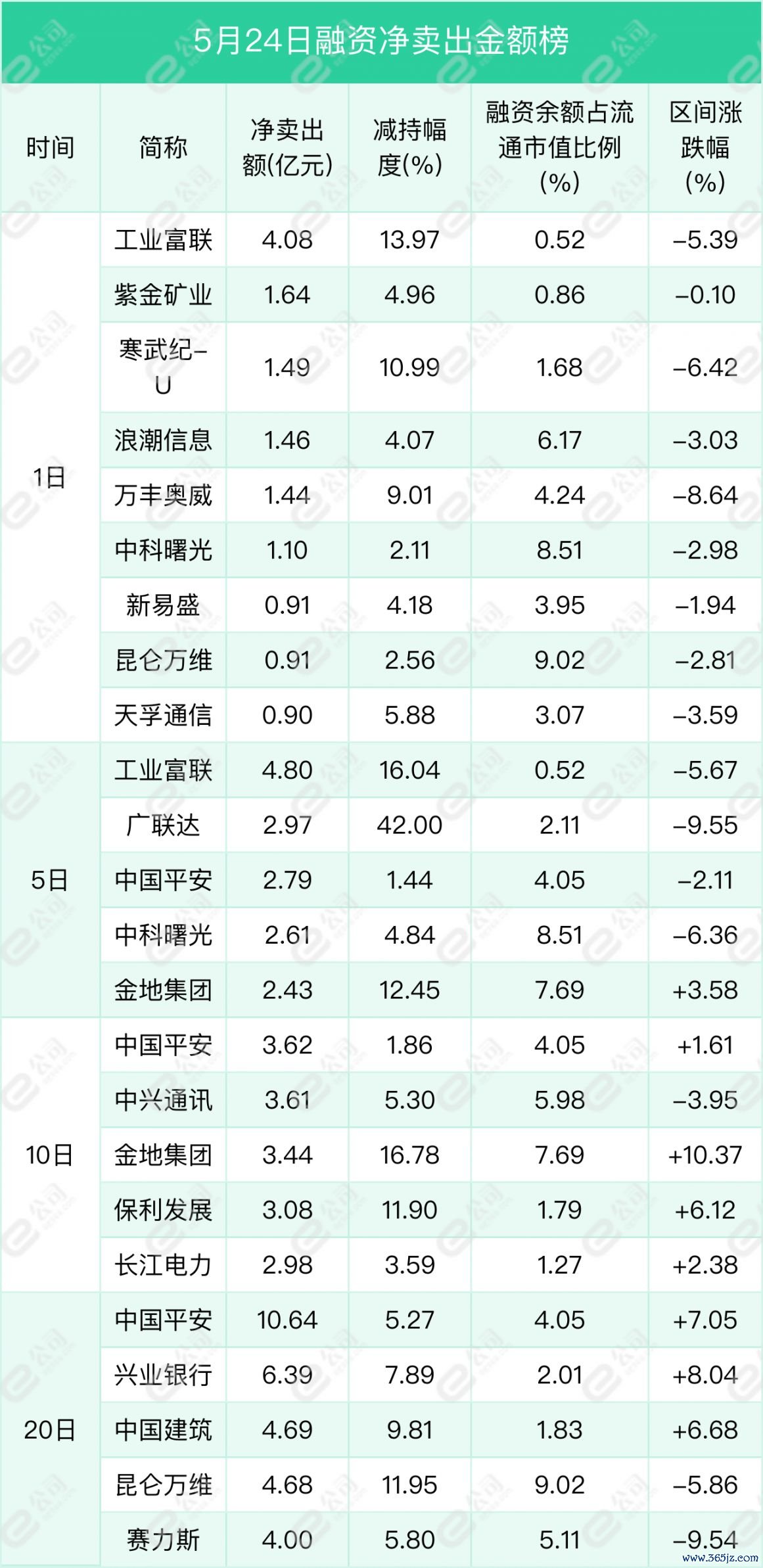 工业富联、紫金矿业、寒武纪-U遭融资净卖出金额居前,分别为4.08亿元、1.64亿元、1.49亿元,减持幅度分别为13.97%、4.96%、10.99%。