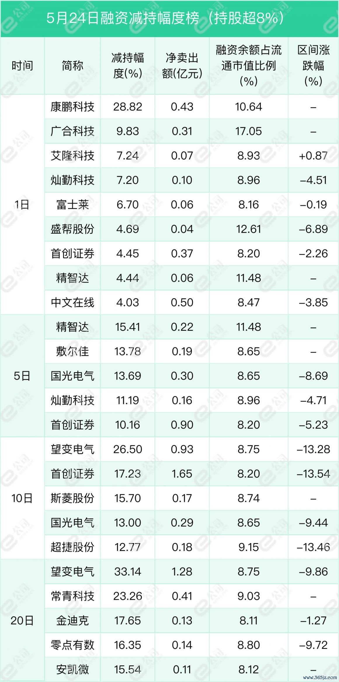 康鹏科技、广合科技、艾隆科技遭融资减持幅度居前,分别为28.82%、9.83%、7.24%。