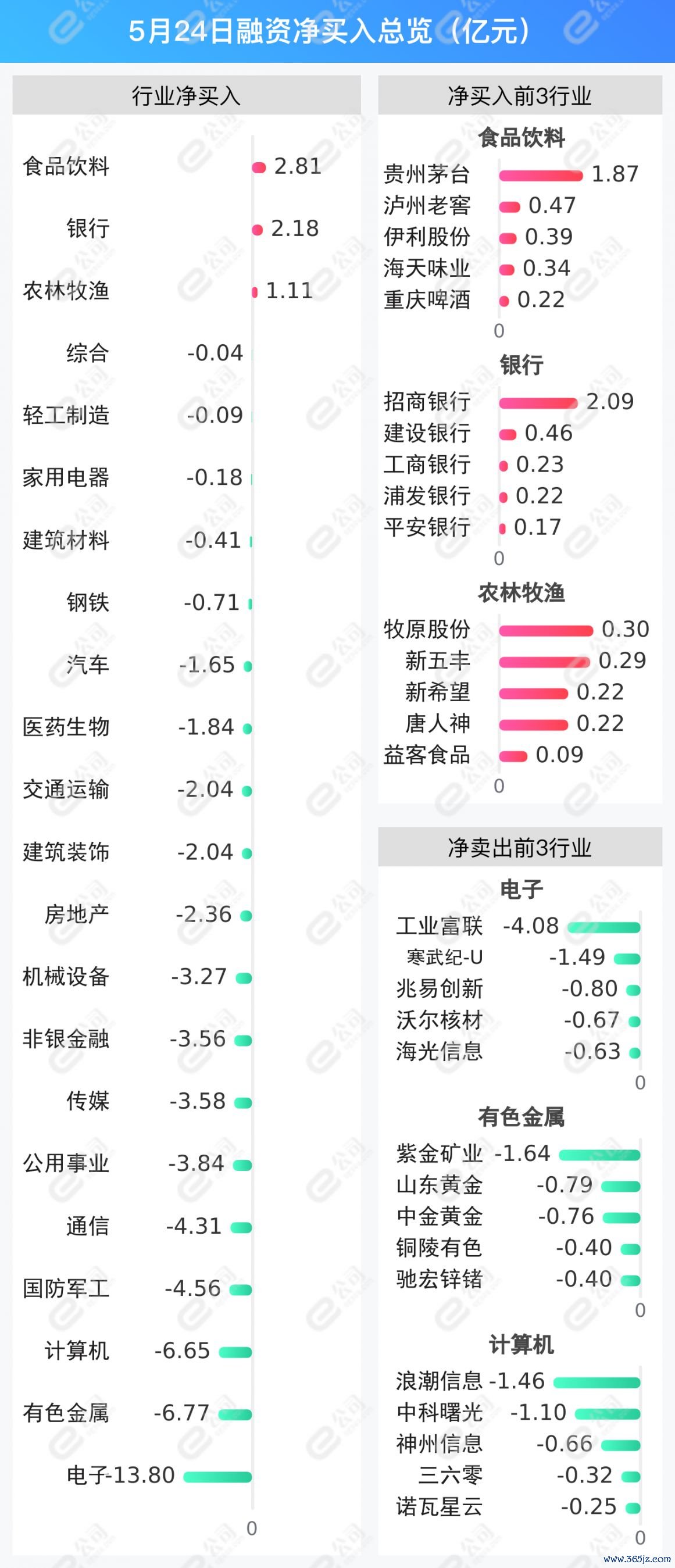 食品饮料、银行、农林牧渔获融资净买入金额居前,分别为2.81亿元、2.18亿元、1.11亿元。