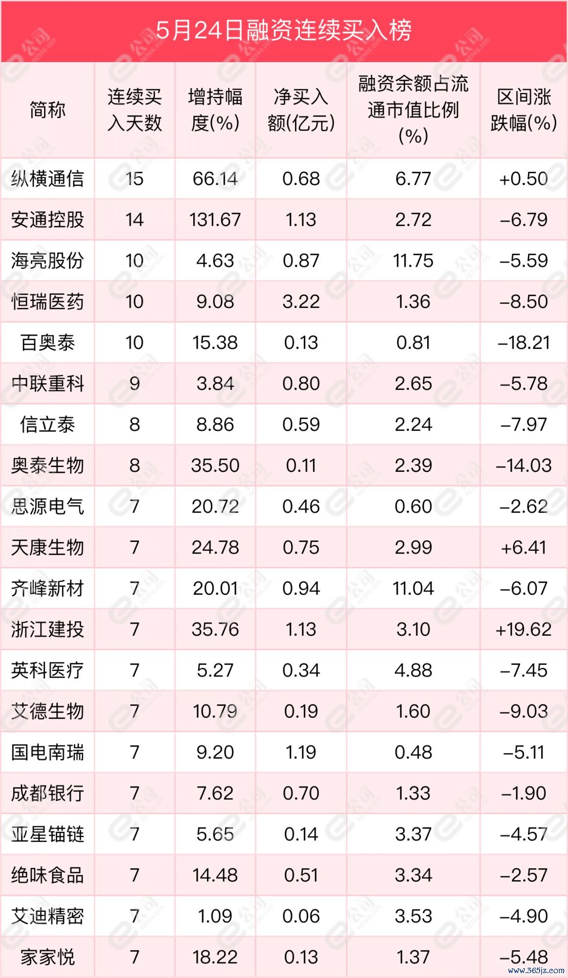 从连续买卖来看,纵横通信、安通控股、海亮股份获融资连续净买入天数居前,分别为15天、14天、10天,期间净买入额分别为0.68亿元、1.13亿元、0.87亿元,期间增持幅度分别为66.14%、131.67%、4.63%。