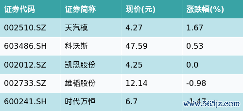 截至收盘股票杠杆网站平台,电芯及PACK主题涨跌幅最高的五只股票为:天汽模(002510.SZ)、科沃斯(603486.SH)、凯恩股份(002012.SZ)、雄韬股份(002733.SZ)与时代万恒(600241.SH)。详情见下表: